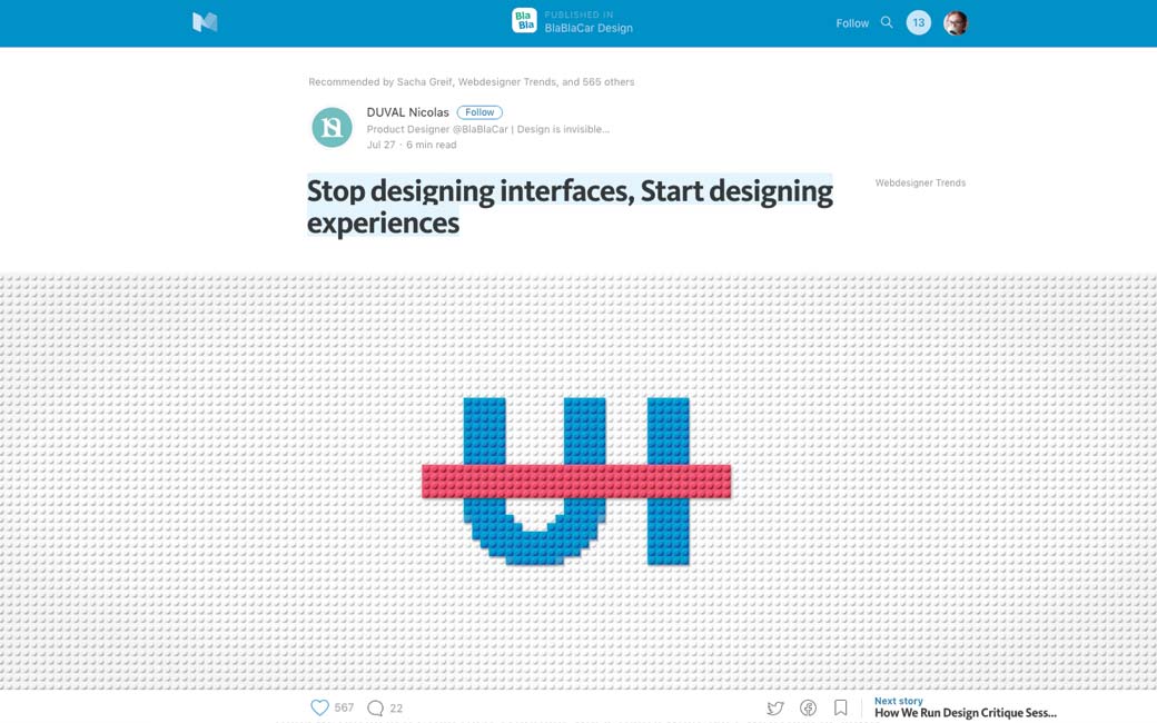Stop designing interfaces, Start designing experiences, retour d’expérience chez Blablacar sur la création d’un système de design en légos pour que les designer puissent se concentrer sur l’expérience et pas sur l’alignement des pixels dans Sketch