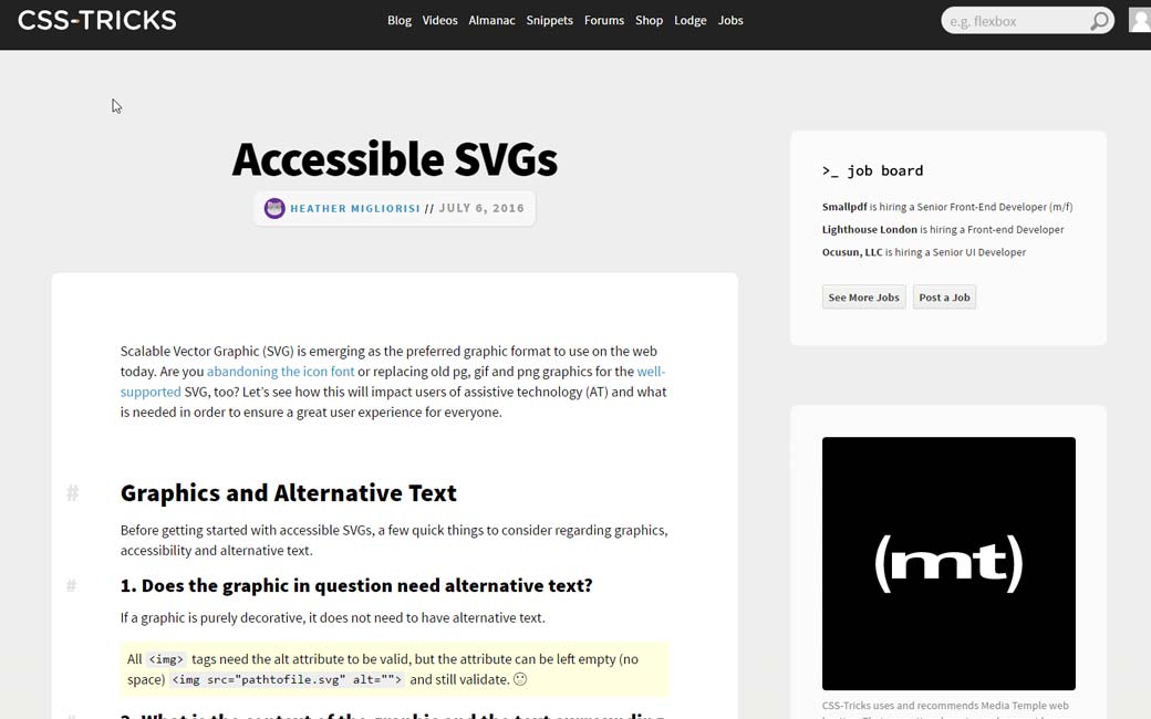 Accessible SVGs, longue lecture très détaillée sur l’accessibilité de différentes techniques d’affichage des SVG