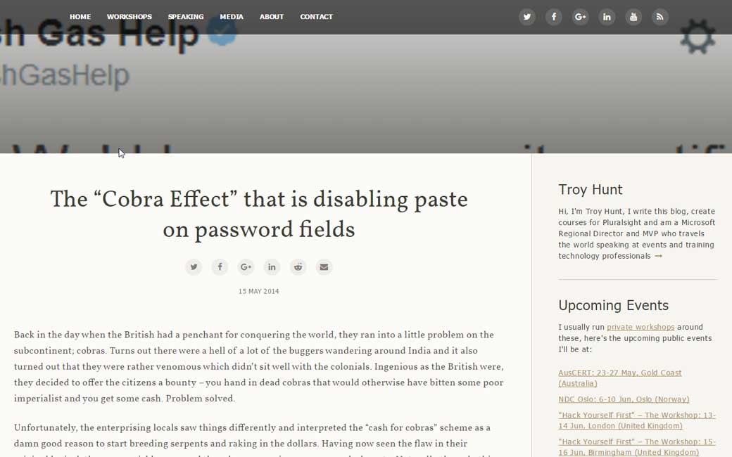 The “Cobra Effect” that is disabling paste on password fields. TLDNR : interdire de copier coller les mots de passe pour des raisons de sécurité ne sert à rien et ennuie les utilisateurs qui ont un gestionnaire de mots de passe.