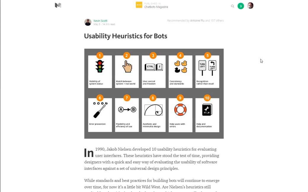 Usability Heuristics for Bots: les critères heuristiques de Nielsen sont ils toujours applicables dans le cas d’une interface comme un chat bot par exemple ?