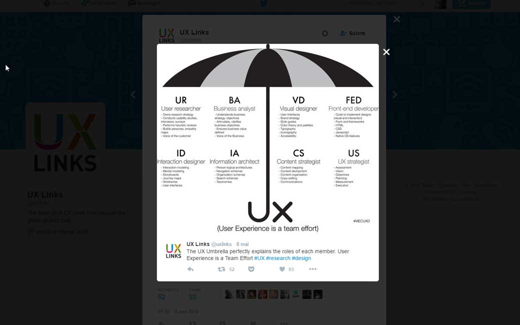 The UX Umbrella, une métaphore des différent métiers composants de l’UX. Je suis donc un mélange entre UR, ID, IA, VD et FED ^^ Feeew :D